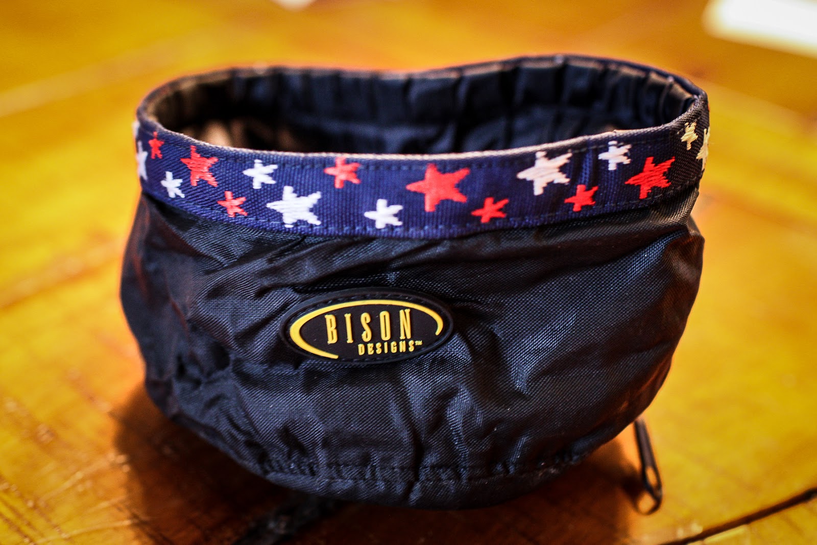 And finally, I carry a collapsible bowl that I can fill up at a water fountain in a park, or from my own supply. I got this one at REI, I love it as it has a carabiner that I clip to the hands free leash: